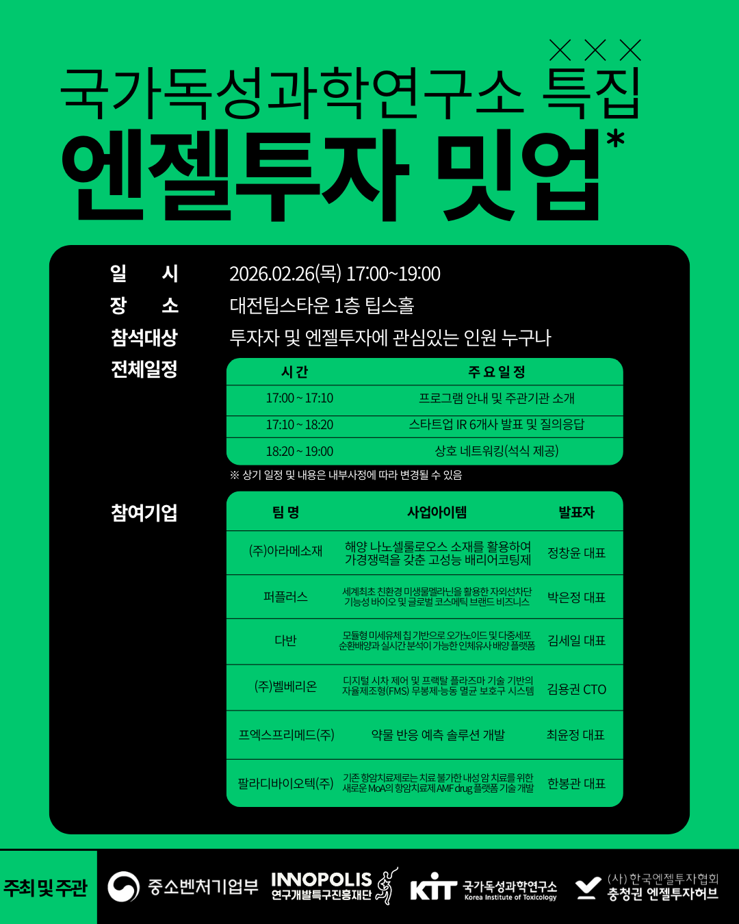 - 주최 및 주관: 중소벤처기업부, 연구개발특구진흥재단, 국가독성과학연구소, 한국엔젤투자협회 충청권 엔젤투자허브